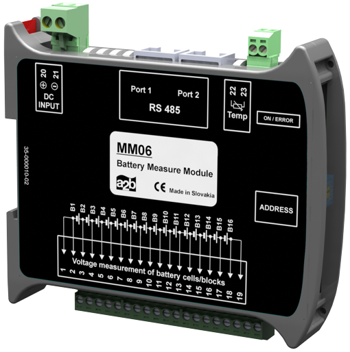 Merací modul MM06 je univerzálne zariadenie určené pre meranie napätia a teploty batérií, článkov batérií. Modul je konštruovaný pre montáž na DIN lištu. Je určený pre priame meranie teploty pomocou prevodníkov MT01 a pre priame meranie napätia. Čelný panel zariadenia obsahuje LED diódu, prepínač pre nastavenie adresy zariadenia.